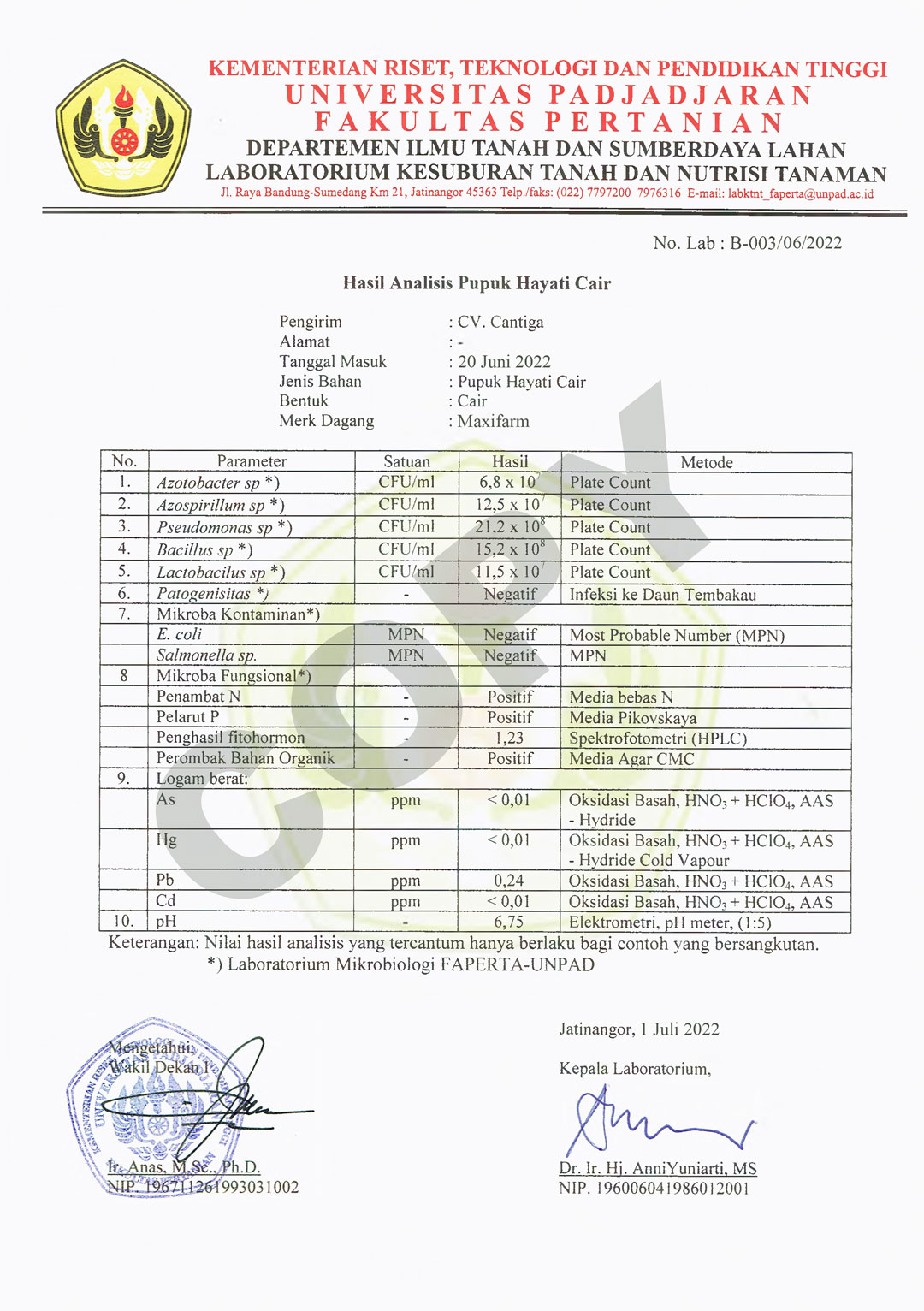 Sertifikat Laboratorium Biologi Tanah